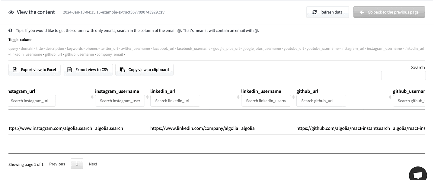 • Export social media urls (Facebook, Instagram ..) from pages